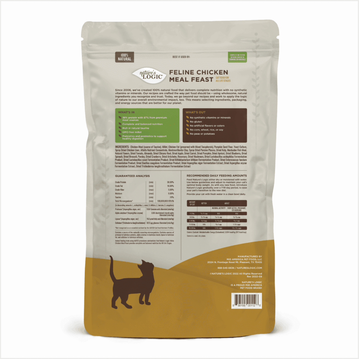Nature’s Logic Feline Chicken Meal Feast delivers 87% of its protein from high quality meat sources and features chicken meal as the first ingredient, which delivers natural sources of taurine. It contains no peas, potatoes, corn, wheat, or soy. It is gluten free and includes prebiotics and probiotics to support healthy digestion. Like all Nature’s Logic kibbles, this recipe delivers its nutrition through wholesome and natural ingredients and contains no added synthetic vitamins and minerals. It’s complete and balanced for cats of all ages, sizes, and breeds.